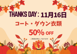 2025年11月の感謝DAY 店舗キャンペーン 2025.11.10 店舗キャンペーン 11月の感謝DAYは11/16(日)になります! コート・ダウン衣類が全品50%OFF!! ぜひこの機会にご利用下さい。 ご来店をお待ちしております(^^)/
